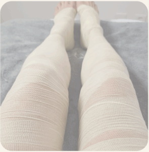 Les bandages sont imprégnés d’actifs qui enveloppent les jambes pour raffermir, drainer et révéler une peau plus lisse. C'est une technique ciblée qui stimule la microcirculation et aide à réduire l’aspect de la cellulite pour une silhouette affinée.
